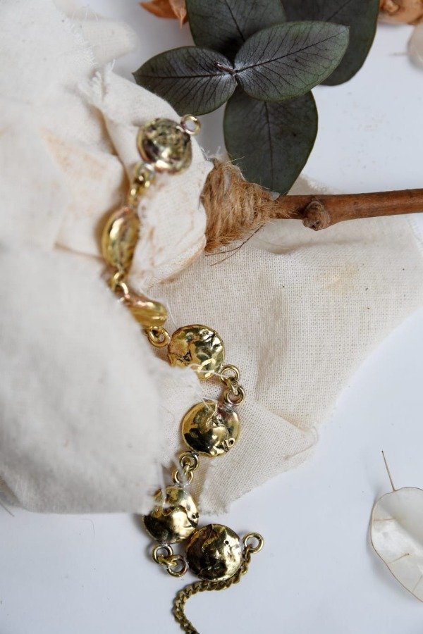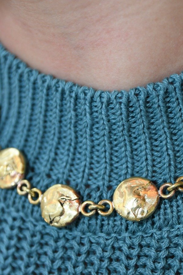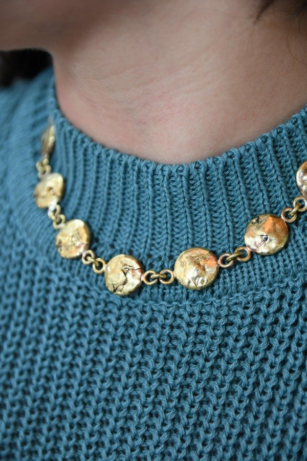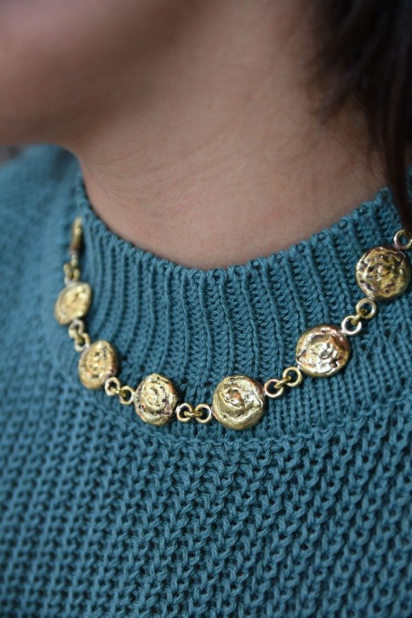 Gargantilla de bronce con detalles tallados a mano en cera. Cierre mosquetón. Cada pieza es única y hecha a mano en Buenos Aires, Argentina. Dependiendo su disponibilidad puede demorar hasta 10 o 15 días hábiles. Se puede realiza en alpaca o bronce. Extensión de cadena de bronce.